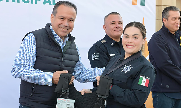 Entrega uniformes, vehículos, chalecos antibalas y dispositivos Taser; El presidente municipal reconoció a los agentes por el esfuerzo