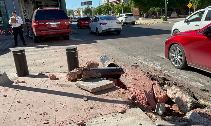 La unidad siguió en descontrol para terminar impactado contra un semáforo peatonal ubicado en la acerca sureste y casi colisiona contra la pared de un negocio de artesanías localizado en el sitio.