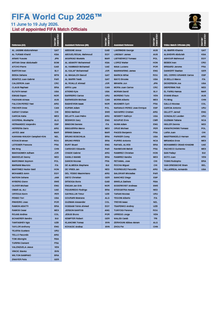 La máxima autoridad del balompié internacional ha ratificado la lista de los oficiales de campo que representarán a México en la próxima Copa del Mundo tras confirmarse que la delegación nacional contará con una presencia significativa tanto en el terreno de juego como en las cabinas de revisión hoy.