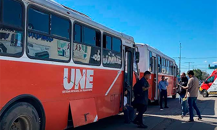 La colisión entre dos unidades de transporte público de la empresa UNE provocó golpes leves a dos mujeres y un adolescente quienes no requirieron traslado a algún hospital