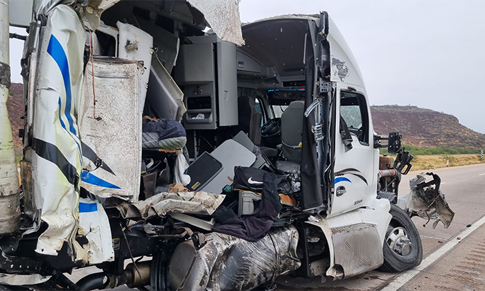 Un fuerte choque entre un tractocamión y un dompe dejó cuantiosos daños materiales y a los operadores con golpes leves la tarde del miércoles, en la carretera de libramiento federal Guaymas-Obregón, a la altura del kilómetro nueve.