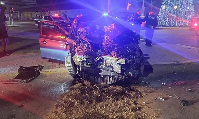 El fuerte “encontronazo” ocurrió alrededor de las 3:00 horas, en el cruce de las calles Miguel Alemán y 200, cuando el conductor de un automóvil sedán color azul, se impactó por alcance contra la vagoneta, color blanco.