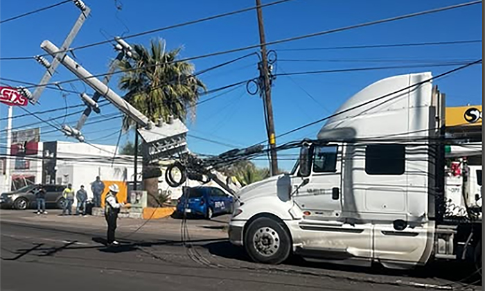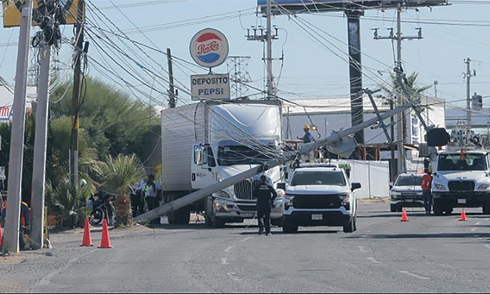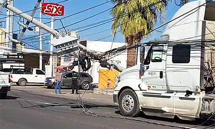 Un tractocamión arrastró cableado y derribó un poste de energía eléctrica propiedad de la Comisión Federal de Electricidad (CFE) lo que dejó sin servicio eléctrico a vecinos del sur de la ciudad.