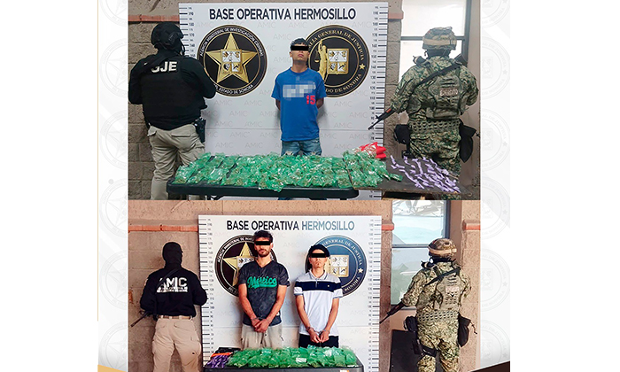 Elementos de la Agencia Ministerial de Investigación Criminal (AMIC), en coordinación efectivos de la Secretaría de la Defensa Nacional (Defensa), en recorridos de prevención y localización de objetivos prioritarios, capturaron a cuatro personas en distintos puntos de la ciudad, en posesión de 352 dosis de narcótico crystal y mariguana.