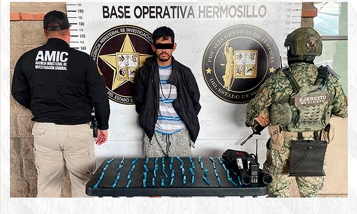 En un reporte, indica que la detención se registró durante un operativo conjunto entre elementos de la Agencia Ministerial de Investigación Criminal (AMIC) y la Secretaría de la Defensa Nacional (Defensa) en calles del fraccionamiento Vista Real en Hermosillo, Sonora.
