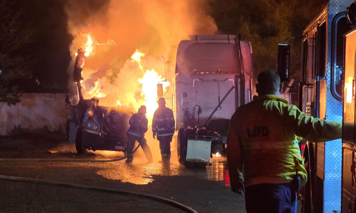 Pérdidas materiales totales en un tractocamión, así como daños en otro, además la evacuación de al menos diez personas de tres viviendas provocó incendio en las unidades de carga, en hechos ocurridos durante la noche de ayer sábado en el fraccionamiento los Lagos, en el sector norte de Guaymas.