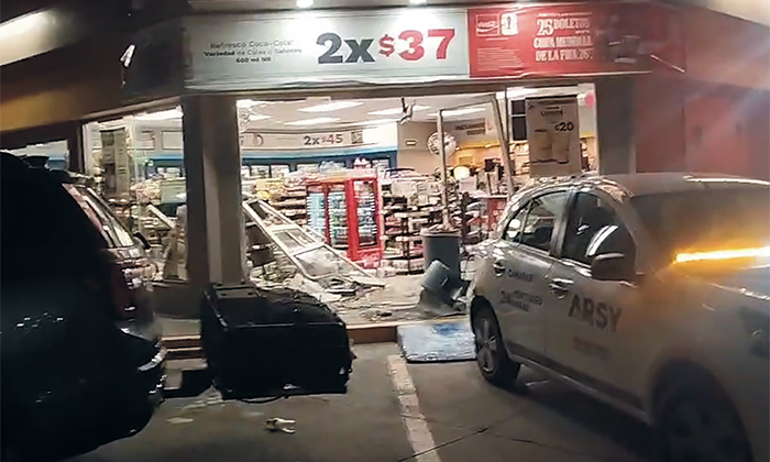 Fue a esa hora cuando la camioneta de color gris con placas del sur del país, se metió de lleno en la tienda de conveniencia de la cadena Oxxo, en donde derribó la puerta y ventana de cristal.